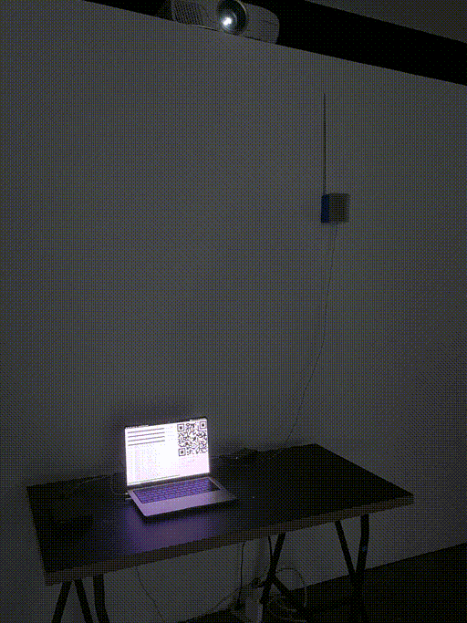 Opposite the projector, my laptop ran the client code. On display are the server’s logs, a QR code which linked to the web interface, and a state transition diagram documenting the system. A device, mounted on the wall, played a low 60 Hz buzz.