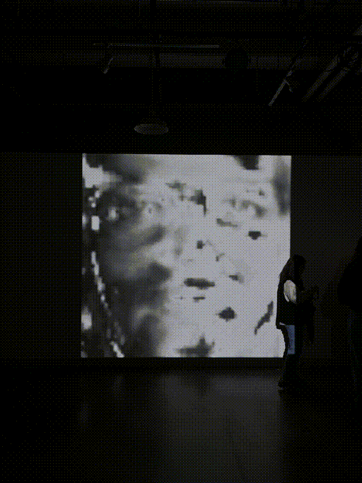 A fine-tuned StableDiffusion model trained on Insecam screengrabs generates CCTV imagery based on bodies detected in the space.