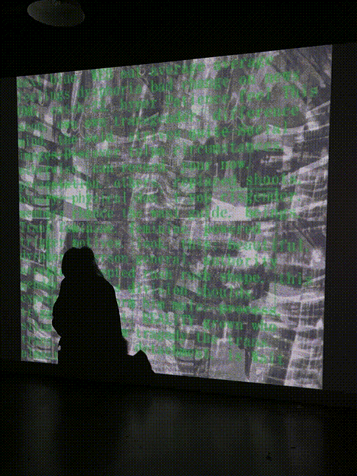 In another state, the system displays a log of words that attendees have clicked in a web interface. The web interface was hosted on the DXARTs GPU server, and displayed infinite Markov-Model musings.